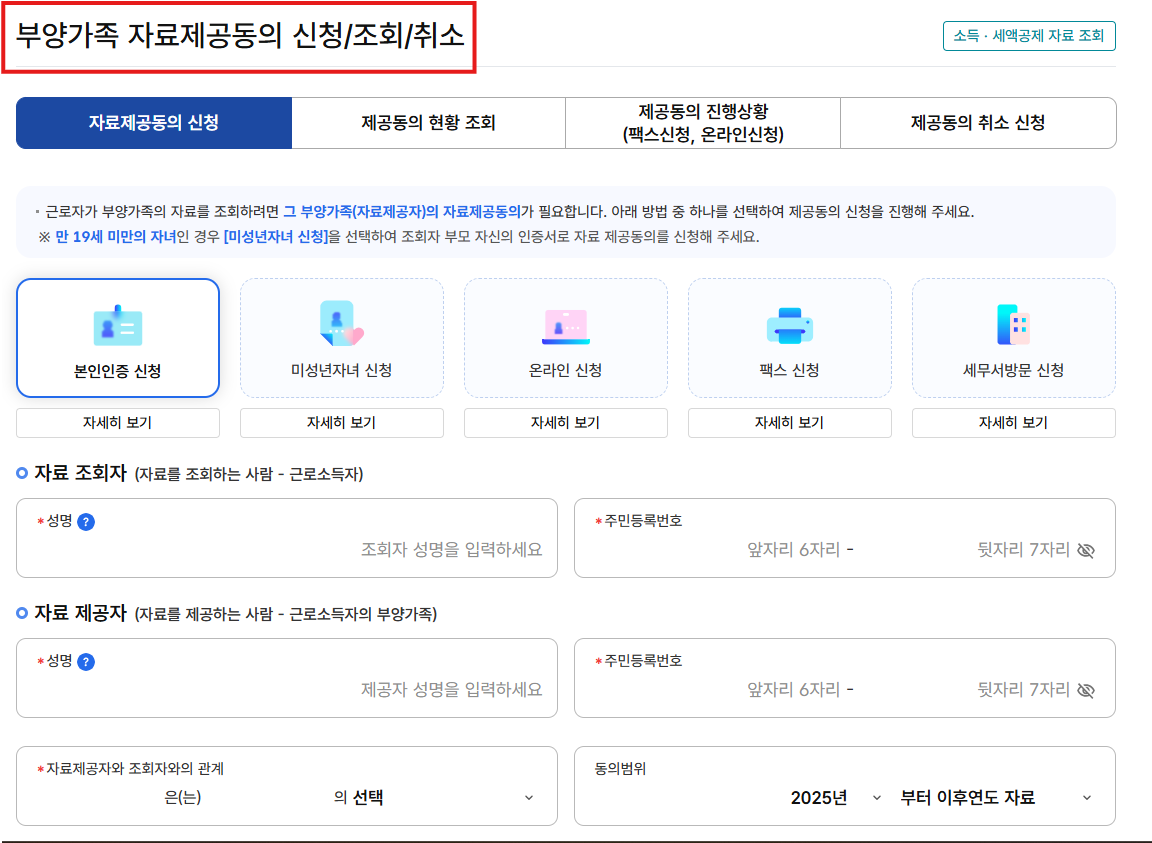 - 정보 제공 동의: 배우자에게 나의 공제 신고 내역을 볼 수 있도록 동의합니다.