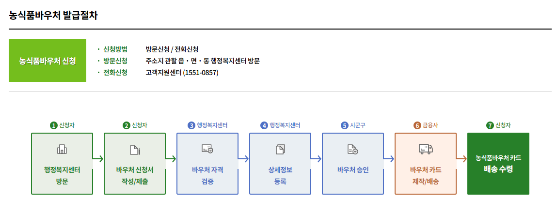 - 온라인 신청: 복지로(bokjiro.go.kr) 홈페이지 또는 농식품 바우처 홈페이지(일부 지자체)